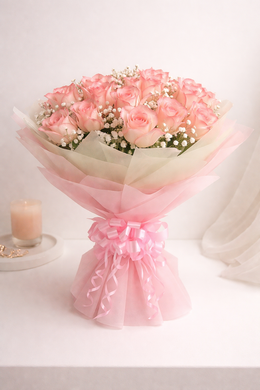 Soft, romantic, and beautifully refined, Blush Embrace features delicate pink roses nestled with fine gypsophila, hand-wrapped in layers of pastel tissue and finished with a graceful ribbon. Elegant yet heartfelt, this bouquet is perfect for celebrating love, appreciation, and tender moments that deserve a gentle touch.