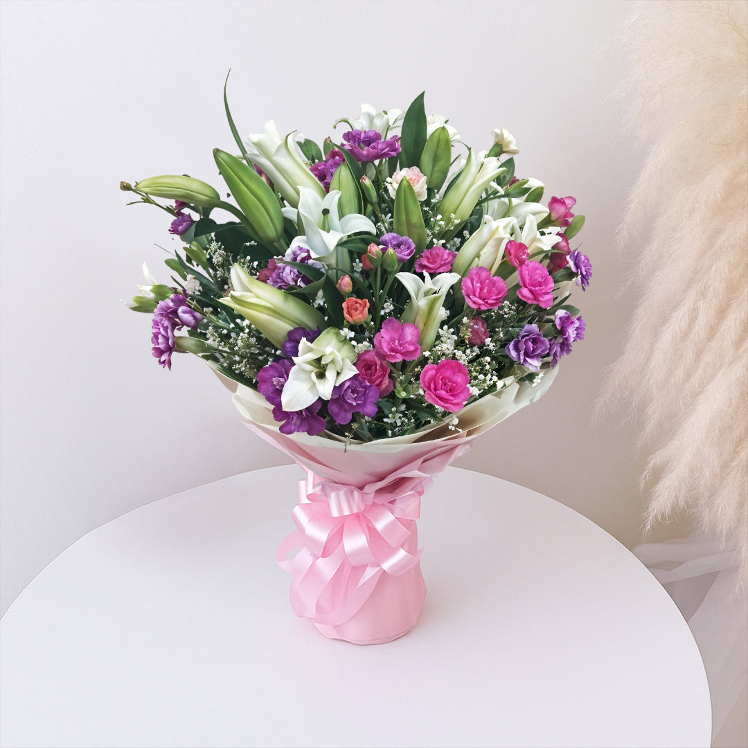 A luxurious, full-bodied arrangement of fragrant oriental lilies and delicate spray carnations, thoughtfully gathered and wrapped in soft tissue. Elegant, graceful, and beautifully abundant, Blushing Opulence is perfect for grand celebrations, heartfelt gestures, and moments that call for timeless sophistication.