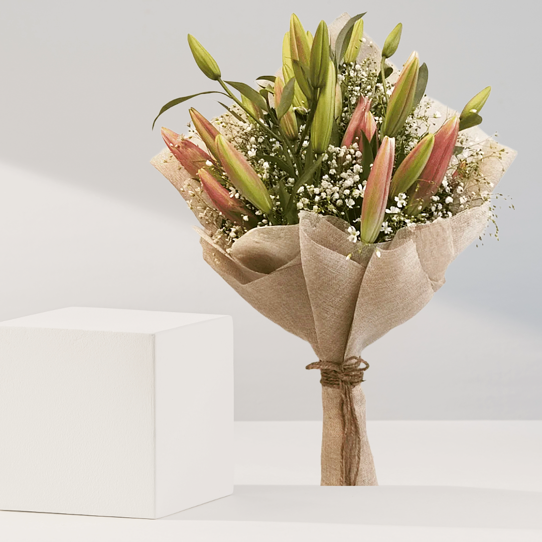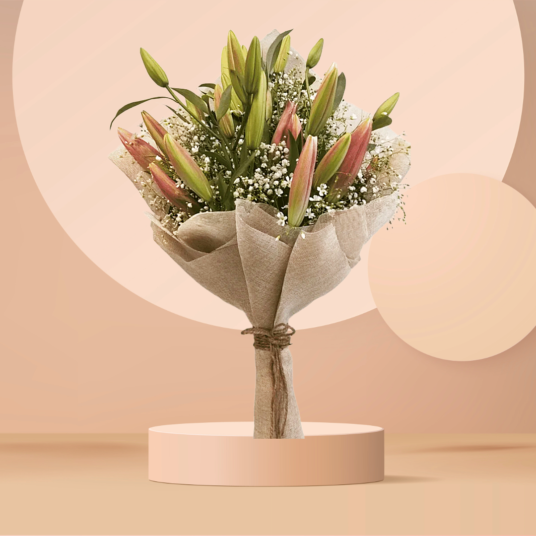 A timeless bouquet of fragrant oriental lilies, beautifully wrapped in natural rustic burlap for an understated, earthy charm. Elegant yet grounded, Rustic Lily Grace celebrates simplicity and sophistication—perfect for heartfelt gestures, serene spaces, and those who love classic blooms with a natural, handcrafted feel.xotic oriental lilies, wrapped in rustic burlap for a fragrant, elegant gift.