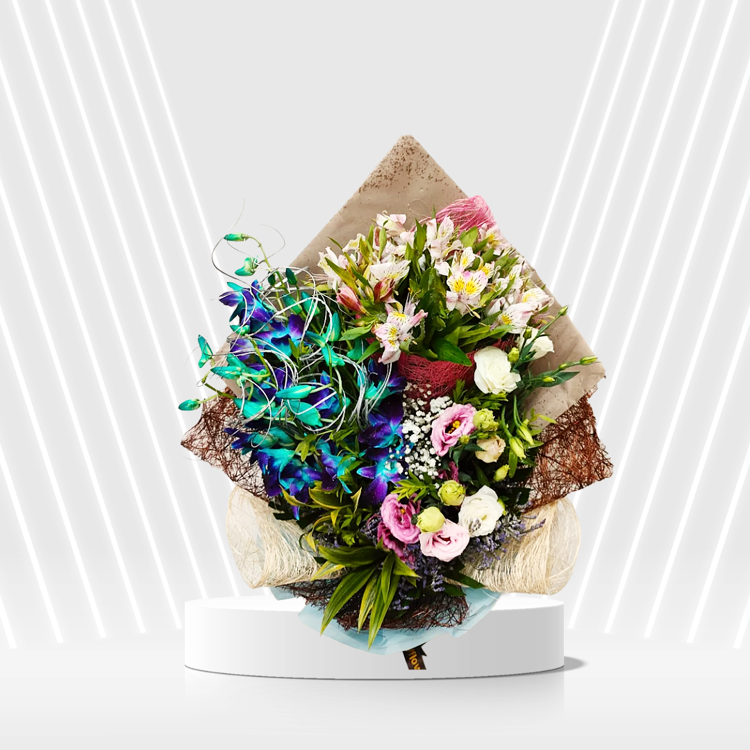 A bold and artistic bouquet that feels like a celebration of colour and texture. Kaleidoscope Bloom brings together striking blue-toned orchid blooms, delicate eustomas, cheerful alstroemeria, and airy fillers, thoughtfully layered with modern wraps and accents. Rich, vibrant, and full of personality, this bouquet is perfect for someone who loves florals with a creative, contemporary edge and a touch of drama.