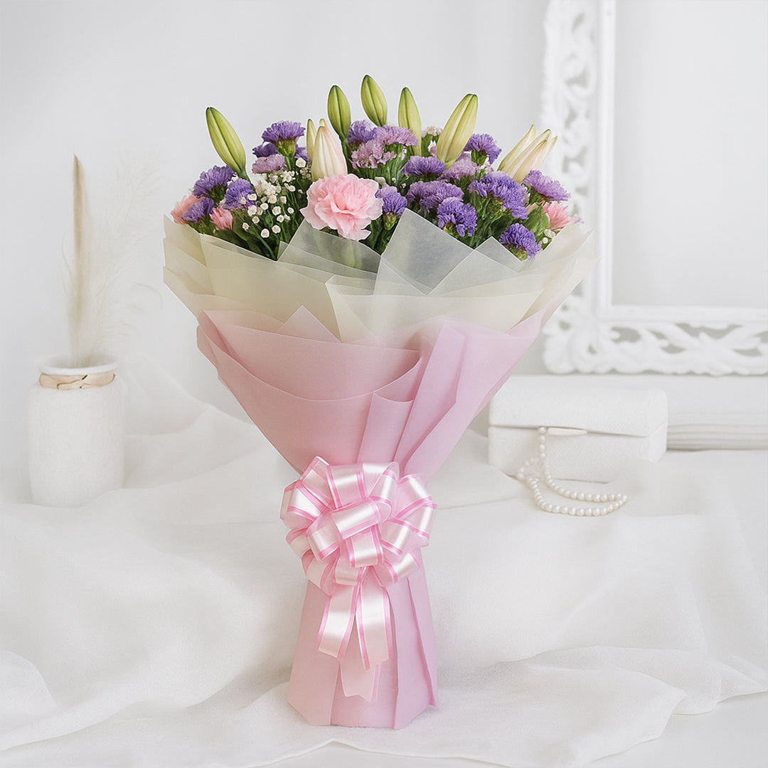 A graceful blend of cool blue daisies, elegant lilies, and soft carnations, this bouquet feels calm, fresh, and quietly striking. Balanced in colour and texture, Blue Reverie is perfect for thoughtful gifting, modern celebrations, and moments of serene beauty.