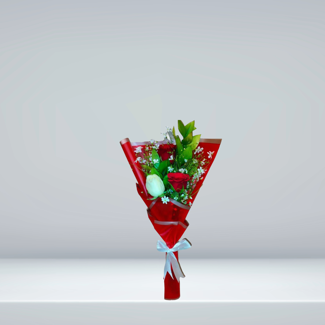2 Red & 1 White Rose with Italian Ruskus leaves, wrapped in Gold Bordered Film Wrap