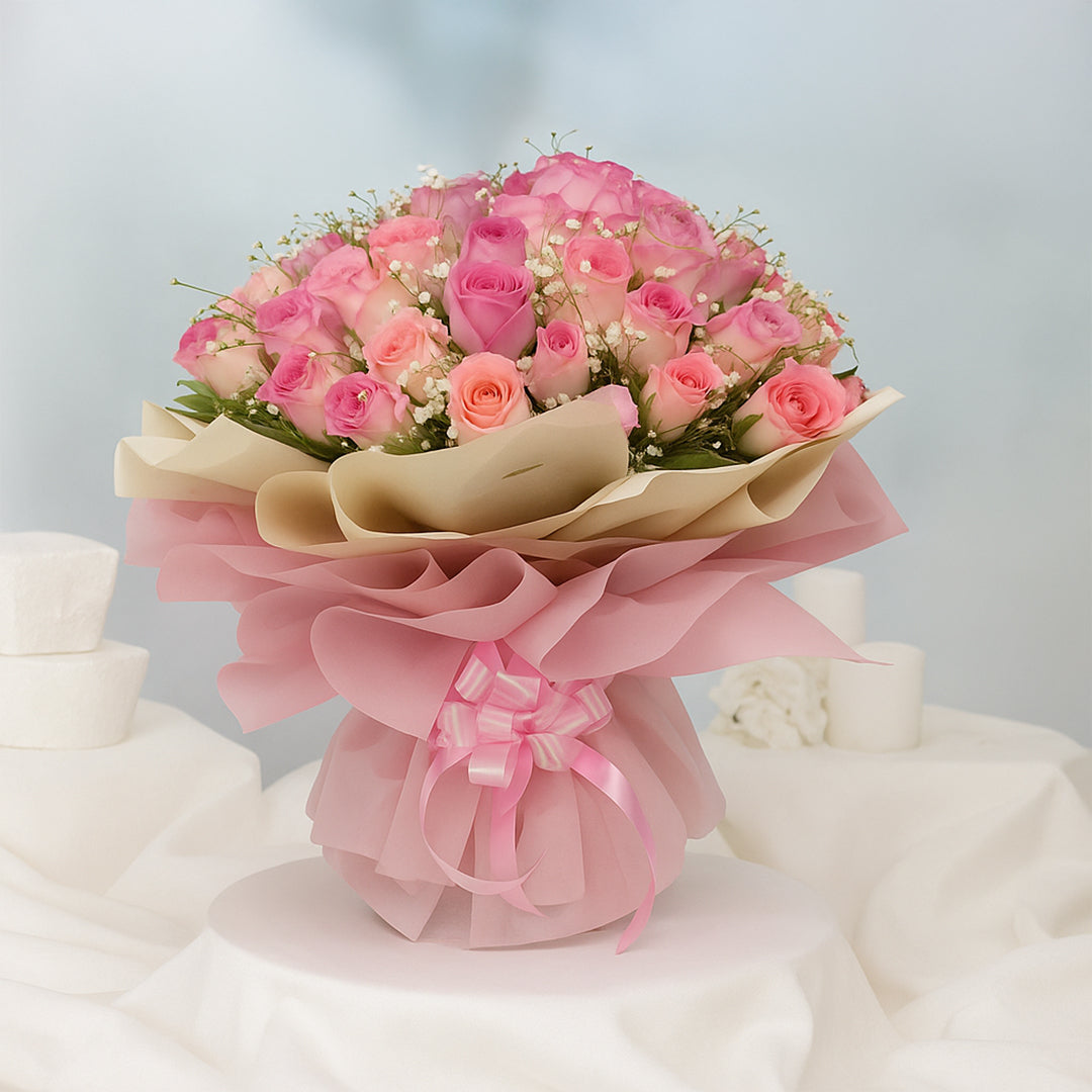 A breathtaking cascade of 60 lush pink roses, wrapped delicately in soft tissue, perfect for celebrating love that feels timeless and true.
