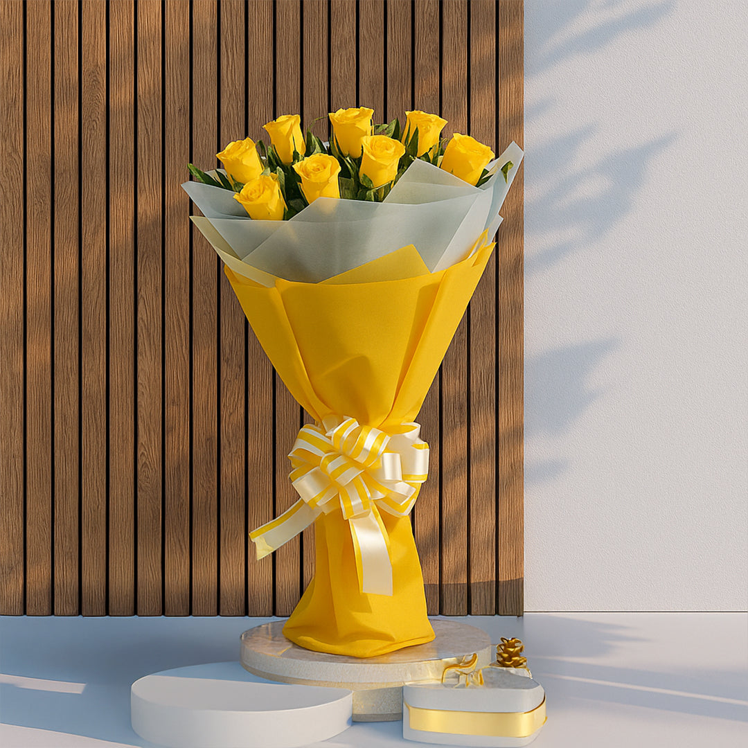 A joyful bouquet of 12 radiant yellow roses, wrapped in soft tissue, symbolising friendship, happiness, and new beginnings—perfect for brightening someone’s day.